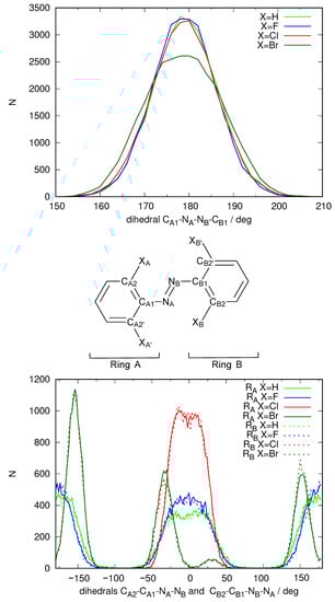 We began the study by analyzing the planarity of the solute molecule in the molecular dynamics simulation. Figure 8 shows the usual selection of dihedrals that help visualizing the coplanarity of the molecule and its phenyl moieties. The distribution of the C-N=N-C dihedral indicates a well-preserved E configuration of the N=N double bond. However oscillations were observed, and the distribution was slightly less sharp than for the other substituents. The orientation of the phenyl rings presented large differences with respect to the other species studied previously. For X=Br the phenyl rings were never found to be coplanar with the N=N double bond plane. Instead, staggered configurations at and to lesser extent were found. Moreover, the areas of the respective maxima of the distributions were unequal. The picture that emerged from these data was one where the phenyl rings could not attain coplanarity with the N=N bond plane, and where a complete flip was difficult (as the areas were of different value). The larger steric hindrance posed by the bulky bromine substituents was very likely the cause for these hindered rotations.