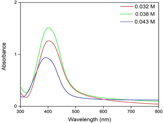 We explore the influence of the TSC concentration on AgNP synthesis. Three TSC concentrations (0.032 M; 0.038 M; 0.043 M) were used. The distance (3.5 cm) from the UV lamp and the irradiation time (60 min) were kept constant. The resultant AgNPs were evaluated from their extinction spectra (Figure 1).
