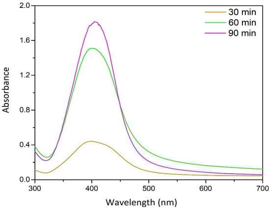 To determine the effect of the irradiation time, the TSC concentration (0.038 M), and the source–sample distance (3.5 cm) were kept constant, varying only the irradiation time. The resultant AgNPs were, again, evaluated from their extinction spectra (Figure 2).