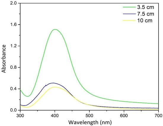 To determine the effect of the UV intensity on AgNP synthesis, the source–sample distance was varied (3.5 cm, 7 cm, 10 cm) while the TSC concentration (0.045 M) and the irradiation time (60 min) were kept constant. The resultant AgNPs were, again, evaluated from their extinction spectra (Figure 3).