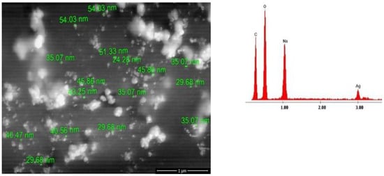 The morphology of the AgNPs was measured using SEM, and qualitative elemental analysis was performed using EDX (Figure 4).