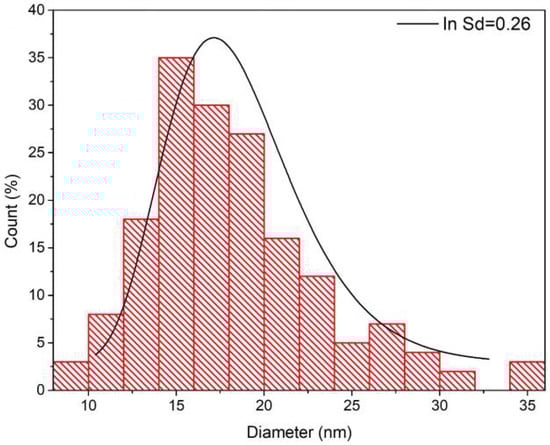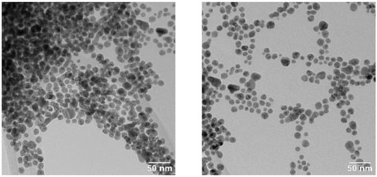 The TEM analysis was performed in order to obtain a better evaluation of the nanoparticle size (the maximum, minimum, and distribution, whilst the SEM analysis was preliminary, conducted in order to obtain an idea of the nanoparticles’ shapes and sizes. In Figure 5, Figure 6 and Figure 7, the TEM micrographs are presented for the optimal sample (0.029 M AgNO3, 0.038 M TSC, irradiation time of 60 min, and a distance from the radiation source of 3.5 cm). The particle size distribution obtained based on the TEM images it is depicted in Figure 8.