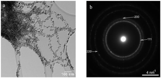 An agglomeration of AgNPs (a) and the electron diffraction pattern revealing the FCC (face-centered cubic) structure of Ag (b); the most intense diffraction rings correspond to (111), (200), and (220) crystallographic planes.