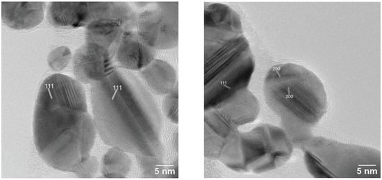 HRTEM images of AgNPs; the lattice fringes correspond to (111) and (200) crystallographic planes of FCC (face-centered cubic) AgNPs.