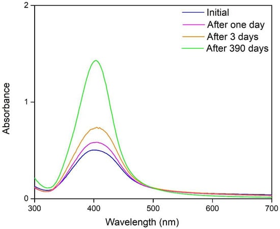 The solution with the obtained silver nanoparticles was monitored for 390 days, revealing changes in the UV-VIS spectra during the study period.
