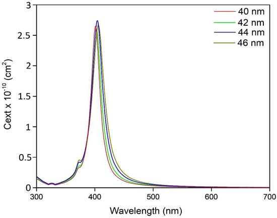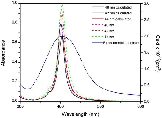 To obtain a more precise comparison, the sample of AgNPs was diluted in order to achieve an absorbance of <1. Following the obtained results, it is evident that the absorbance of the theoretically calculated spectra decreases with the growth of the nanoparticles diameter, thus indicating the fact that the nanoparticle concentration decreases (lower absorbance), with the increasing size of the particles. It can also be observed that the wavelength at which the LSPR occurs (401 nm for D = 40 nm; 403 nm for D = 42 nm; 404 nm for D = 44 nm) is directly proportional to the increasing size of AgNPs, indicating a correlation between AgNP morphology and the LSPR wavelength, a fact which has been demonstrated in several papers [59,60,62,69].