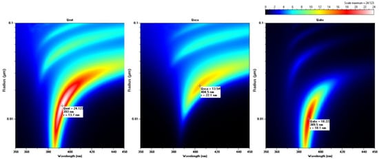 The spectra represented in this figure were obtained using the Mie Plot software [65], and they are representative of silver nanospheres with a diameter of 40–46 nm. In order to be able to compare the theoretical results with the experimental ones, it is necessary to perform the following calculations.