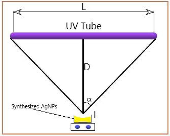 To obtain information regarding the synthesis process, the following parameters were varied: (i) TSC concentration (0.032 M; 0.038 M; 0.043 M), (ii) UV irradiation time (30 min, 60 min, and 90 min), (iii) the distance between the irradiation source and the sample (3.5 cm, 7 cm, and 10 cm), (iv) stability studies and evolution over time. All solutions were prepared using double distilled water. The synthesis of AgNPs was carried out as follows. To 30 mL of one of the TSC solutions, a volume of 1 mL of AgNO3 (0.029 M) was added dropwise with constant stirring. The resulting solution was left to be stirred for 10 min. The next step was the transfer of the solution to a Petri dish (to facilitate the penetration of the UV radiation through the entire volume of the solution). The Petri dish with the solution was subjected to UV irradiation, while keeping the solution under magnetic stirring. It is worth mentioning that the Petri dish was in the middle of the UV lamp, the UV lamp was oriented above the Petri dish, and both were enclosed in a box without any interference from outside. The schematic representation of the synthesis of AgNPs is presented in Figure 13 [55].