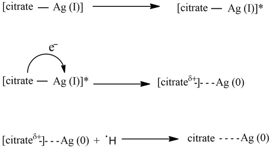 One of the major advantages that this type of synthesis offers is the benefit of a controlled “activation.” Thus, the reactants may be premixed, kept in the dark, and exposed to UV irradiation when one wishes to obtain AgNPs.