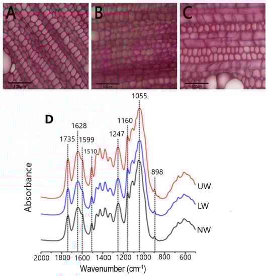 Microscopic observation of stem sections. (A) Normal wood (NW), (B) lower wood (LW) and (C) upper wood (UW) formed in response to bending stress. Staining was performed using phloroglucinol. No clear G layer formation was seen in TW. (D) Results from FT-IR spectroscopy of N. cadamba wood: infrared spectra of NW, LW and UW samples.