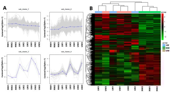 To further check the transcriptome profile differences between NW, LW and UW samples, three young stems from each group were sampled for RNA-Seq analysis. After quality evaluation, 416,038,776 clean reads were generated (Table S2), which were genomically aligned at over 93%, with 94.07–95.29% of the matched sequence reads uniquely aligned with the reference genome sequence (Table S3). The high repeatability of data for all three biological replicates was confirmed via high Pearson correlation coefficient (r2 > 0.90) values (Figure S1). All differentially expressed genes (DEGs) were used for cluster analysis, and the whole data were divided into three clusters (Figure 2A). Based on the DEGs data, the three NW1-3 and UW1-3 samples were grouped into two different clusters, while the LW1-3 samples were worse and were grouped into NW and UW groups. Moreover, the gene expression patterns of NW, LW and UW samples were significantly different. It is clear from the heat map (Figure 2B) that genes with higher expression in NW samples have a lower expression in LW and UW samples, and vice versa.