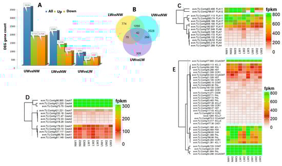 Differential expression of significant genes. (A) Number of DEGs up- or downregulated in the studied wood samples. (B) Venn diagram showing shared and unique unigenes among different studied samples. (C) Differential expression of FLA genes. (D) Expression of cellulose synthesis-related genes. (E) Differential expression of genes responsible for lignin biosynthesis.