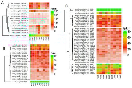 (A) DEG of β-galactosidase-encoding genes involved in G layer formation. (B) Differential expression of gravity-related genes. (C) Differential expression of genes and transcriptional factors associated with vascular bundle and cambium development and proliferation.