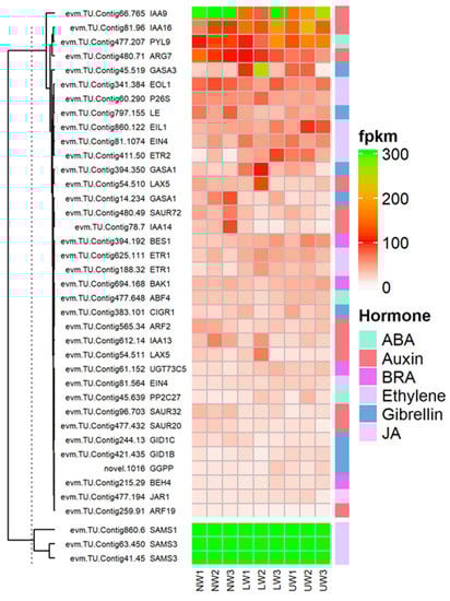 Plant hormones, as core regulators of plant growth and development, not only regulate internal developmental processes, but also help plants to survive harsh external environments [54,55]. Regarding brassinosteroid (BR), BRI1-ASSOCIATED RECEPTOR KINASE 1 (BAK1)-associated unigenes evm.TU.Contig694.168 and evm.TU.Contig16.193 showed higher expression in UW samples, while evm.TU.Contig256.105 was highly expressed in both LW and NW (Figure 5). These two factors are associated with BR perception and extreme twist and form an integral BR-binding pocket. The expression of BRASSINOSTEROID-INSENSITIVE 4 (BIN4), a master negative regulator of the BR signaling pathway, was upregulated in LW and UW samples (Figure 5). Similarly, the expression of BRASSINOSTEROID ENHANCED EXPRESSION 1 (BEE1), which is involved in the early response required for brassinosteroid (BR) action, was upregulated in NW and LW compared to UW samples (Figure 5). The expression of BES1/BZR1 homolog protein 4 (BEH4) (evm.TU.Contig215.29 and evm.TU.Contig434.57 [47]) was upregulated in UW and LW samples, while BES1/BZR1 homolog protein 2 (BES1) (evm.TU.Contig394.192) was upregulated in UW (Figure 5). PROTEIN PHOSPHATASE 2A (PP2A), an activator of BZR1 and BES1, was downregulated in UW and LW (Figure 5).