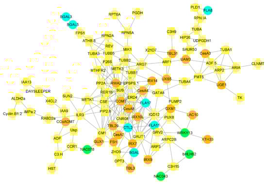 A correlation analysis in R was used to identify genes and TFs that were strongly correlated with genes associated with G layer synthesis. Initially, the highly expressed genes (fpkm > 20) were filtered out of the entire dataset, and correlation analysis was performed. Only highly correlated genes (r2 > 0.97 and p value ≤ 0.005) from the results were imported into cytoscape software to create a co-expression network.