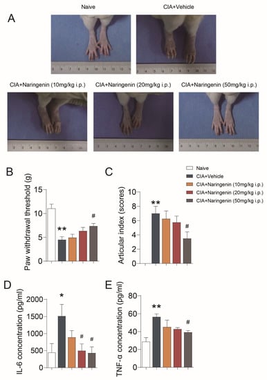 - Rats were divided into five groups: A naive group, a CIA+vehicle group, and CIA+NAR low (10 mg/kg), medium (20 mg/kg), and high dose (50 mg/kg) groups; eight rats per group. Rats were injected intraperitoneally with 40 mg/kg pentobarbital sodium to induce anesthesia and were sacrificed by CO2 (100% concentration, for 12 min) on day 42, and the peripheral blood and knee joints were harvested.