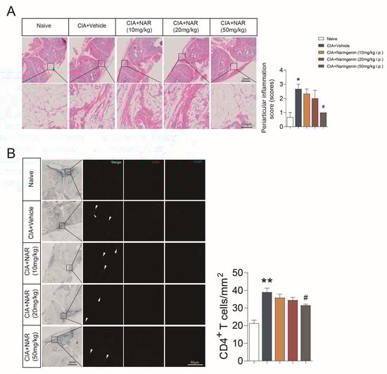 2.2. NAR Alleviated the Periarticular Inflammation Scores and Synovial Infiltration of CD4+ T Lymphocytes
