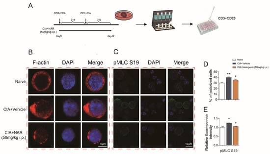 - Mice were divided into three groups: A naive group, a CIA + vehicle group and a CIA + NAR (50 mg/kg); 10 mice per group. The mice were sacrificed by CO2 (100% concentration, for 3 min) on day 42, and the spleen was harvested.