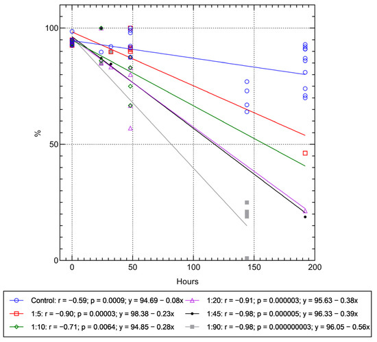 - Strong (r > 0.7) linear, dose- and time-dependent (up to 8 days) regression was observed between the in vitro decrease in cell viability and the number of microvesicles absorbed (5–90 microcapsules per cell). According to the regression equations, the approximate time-to-complete-death of hAMSCs at different concentrations of microcapsules in culture can be 428 h (1:5 ratio), 339 h (1:10), 252 h (1:20), 247 h (1:45), and 170 h (1:90 ratio).
