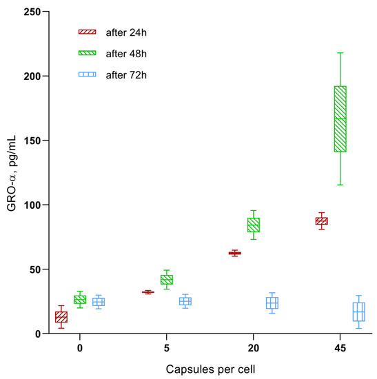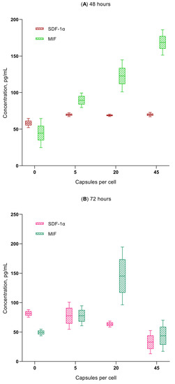 - Microcapsule uptake (1:5, 1:20, and 1:45) results in a dose-dependent (up to 0.18–0.2 ng/mL) increase in secretion of the chemokines GRO-α (CXCL1), MIF, and SDF-1α (CXCL12) in hAMSCs culture, which are capable of stimulating the activity of both stem and tumor cells (see Discussion). This is classified as average (0.1–1 ng/mL) secretory activity according to [73].