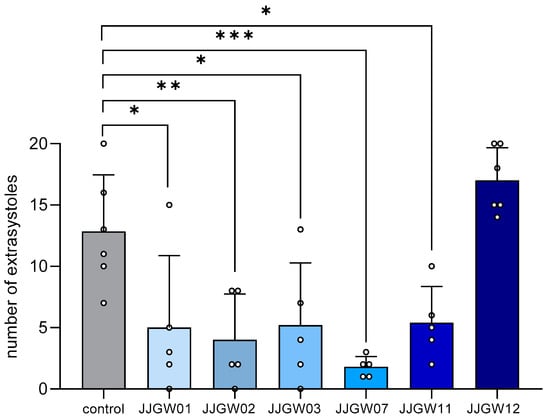 All the tested compounds (except for JJGW12) significantly reduced the number of adrenaline-induced extrasystoles by 58–86% compared to the control group (F(6,30) = 10.61, p < 0.0001) (Figure 1).
