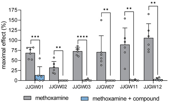 JJGW01, administered at a dose of 1 mg/kg, attenuated the methoxamine pressor response in rats by 81% (t(5) = 7.103, p < 0.001). The pressor effect of methoxamine was also abolished after the injection of JJGW02 and JJGW11 at a dose of 2.5 mg/kg by 100% (t(5) = 5.225, p < 0.01) and by 99% (t(5) = 5.287, p < 0.01), respectively. Moreover, the administration of JJGW03, JJGW07, and JJGW12 at a dose of 5 mg/kg reversed the pressor effect of methoxamine by 99% (t(5) = 15.610, p < 0.0001) by 100% (t(5) = 4.294, p < 0.01) and by 97% (t(5) = 7.252, p < 0.001), respectively (Figure 2).