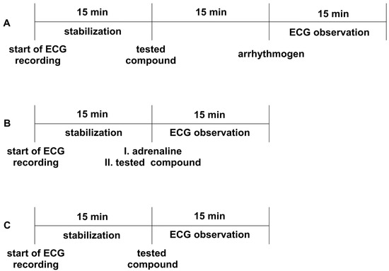 All the experiments were performed according to the method described by Szekeres and Papp [71]. The animals were anesthetized with thiopental (75 mg/kg ip). Depending on the model, either adrenaline, aconitine, or calcium chloride was used as an arrhythmogen. Adrenaline and aconitine were administered iv at a dose of 20 µg/kg, whereas calcium chloride was administered at a dose of 140 mg/kg to induce heart rhythm disturbances. The tested compounds were injected iv 15 min before the arrhythmogen. Aspel ASCARD apparatus (standard II lead, with the tape speed 50 mm/s and voltage calibration 1 mV = 1 cm) was used for ECG measurements. The ECG was recorded during the first 2 min and in the 5th, 10th, and 15th min after the arrhythmogen injection (Figure 3A). The lack or decreased amount of extrasystoles, atrioventricular blocks, bradycardia, and fibrillation in the ECG recordings compared to the control group was the criterion of the antiarrhythmic activity. The ED50 was calculated using the method of Litchfield and Wilcoxon [50]. All the tested compounds were administered at a dose of 5 mg/kg, and we gradually decreased the dose by half until the antiarrhythmic activity disappeared.