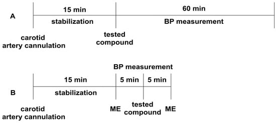 The experimental setup for studying the influence of the tested compounds on blood pressure (Panel A), and the pressor response to methoxamine (Panel B) in normotensive rats. All the compounds were administered intravenously (iv). ME—methoxamine (150 µg/kg), BP—blood pressure.