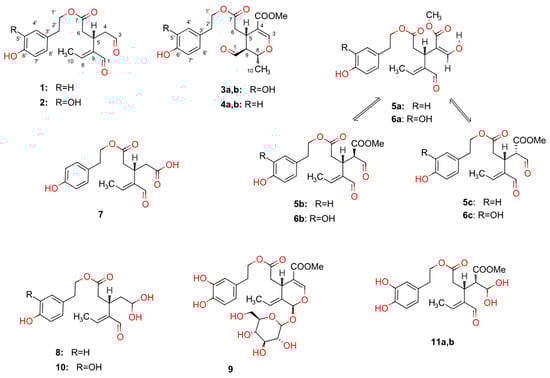 Structures of the studied OOPs and related compounds: oleocanthal (1), oleacein (2), oleuropein aglycone (3a,b), ligstroside aglycone (4a,b), oleomissional (6a,b,c), oleokoronal (7a,b,c), oleocanthalic acid (7), oleocanthadiol (8), oleuropein (9), oleaceinediol (10) and oleomissionadiol (11a,b).