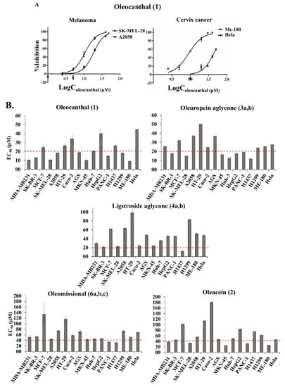 To evaluate the anti-cancer potential of a compound, its cytotoxicity against non-tumorigenic cell lines must be determined in order to calculate the selectivity index value (SI). Comparison of the OOPs’ selectivity indexes for the cell lines (cancer and non-tumorigenic transformed cells) of the same tissue origin (i.e., the ratio of EC50 for non-tumorigenic cells/EC50 for cancer cells) summarized in Table S3 indicated that the SIs ranged between 0.1–2.8 [80]. Oleocanthal (1) and the two aglycones (3a,b and 4a,b) displayed SI > 2 for the melanoma cell line SK-MEL-28 (2.4, 2.8 and 2.1, respectively) while ligstroside aglycone (4a,b) showed moderately good selectivity for some breast cancer cell lines, as well (Table S3). According to Weerapreeyakul et al. (2012), a SI value ≥3 is required for classifying a compound as prospectively anti-cancer [81], but others consider SI values >2 as a positive indication for further investigation of a compound’s anti-cancer potential [82,83].