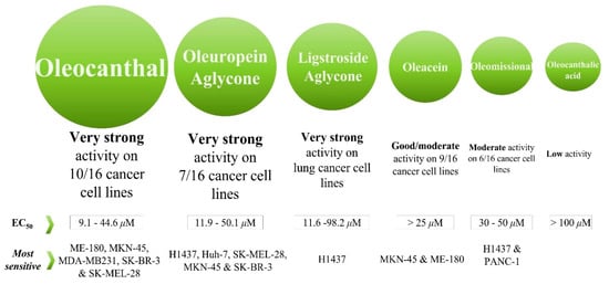 Finally, the ME-180 cervical cancer cells were more sensitive than the Hela to all OOPs with oleocanthal (1) the most effective and oleuropein aglycone (3a,b) the second. Once more, the EC50 value reported in the present study for the activity of oleocanthal (1) on Hela cells was 44.6 μΜ, while in another study, an EC50 value >150 μΜ was calculated for oleocanthal [75].