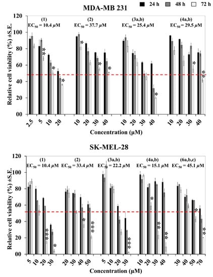 Time- and dose-dependent effect of OOPs on MDA-MB231 and SK-MEL 28 cell lines. Cells were treated with different concentrations (2.5–70 μΜ) of oleocanthal (1), oleacein (2), oleuropein aglycone (3a,b), ligstroside aglycone (4a,b) and oleomissional (6a,b,c). Cell viability was measured using the ATP-based luminescence assay at the end of 24, 48 and 72 h treatment. Results from two independent experiments performed in triplicate. Bar graphs represent the mean cell count ± SE in each treatment group normalized to the control group (i.e., cells treated only with 0.2% (v/v) DMSO). * p < 0.05; ** p ≤ 0.01; *** p ≤ 0.001 (t-test) comparing viability in the treatments for 48 h and 72 h.
