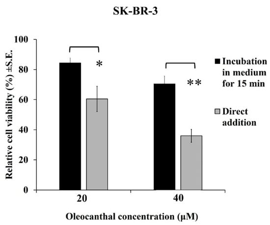 Partial deactivation of oleocanthal (1) in culture medium. SK-BR-3 cells were treated with two different concentrations of oleocanthal (1) at two different concentrations (20 and 40 μM) for 48 h. Viable cell numbers were determined using the ATP-based luminescence assay after 48 h of treatment. The compound was added to the cells either directly or after incubation with the culture medium for 15 min. The results presented are from four independent experiments performed in triplicate. Bar graphs represent the mean cell count ± SE in each treatment group normalized to the control group (i.e., cells treated only with 0.2% (v/v) DMSO). * p < 0.05; ** p ≤ 0.01 (t-test) comparing the two different treatment methods.