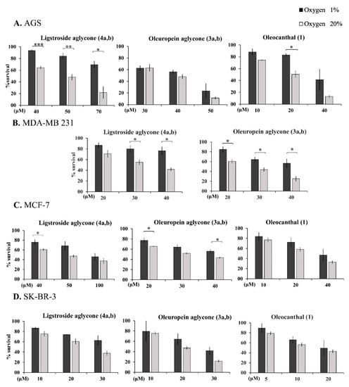 The effects of drugs on cancer cell lines are usually tested under atmospheric conditions (20% (v/v) O2). However, the O2 content in tissues (normoxia) and solid tumors (hypoxia) is ≤ 5% (v/v). In some tumors (i.e., pancreatic tumors) the % O2 is even ≤ 1% (v/v) [54,86,87]. This affects cell metabolism and signaling pathways which depend on the hypoxia-induced Factor 1A (HIF1A) and it could affect the activity of certain drugs [59,63,88,89,90]. To examine if low O2 levels modify the activity of OOPs, oleocanthal (1), oleuropein aglycone (3a,b) and ligstroside aglycone (4a,b) were tested under low O2 concentration (i.e., 1% (v/v) (hypoxia)) in comparison to 20% (v/v) (atmospheric O2 levels in tissue culture) at three different concentrations close to the EC50 value for each OOP for the cell lines analyzed (Figure 6). The effects of these three OOPs were tested on the MDA-MB 231, SK-BR-3 and MCF-7 breast cancer and on the AGS stomach cancer cell lines.