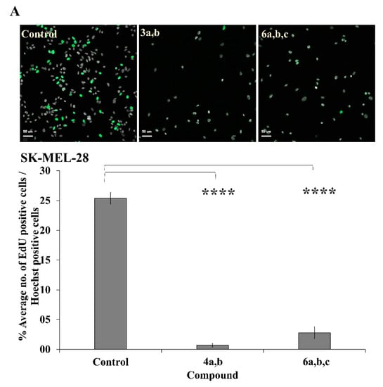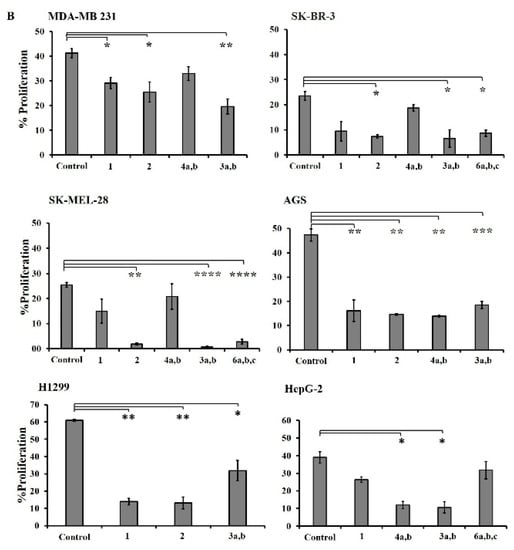For this purpose, ten cancer cell lines (i.e., MDA-MB 231, SK-BR-3, MCF-7, A2058, SK-MEL-28, AGS, HepG-2, PANC-1, H1299 and Hela) originating from breast, melanoma, stomach, hepatic, pancreatic, lung and cervical tumors were analyzed in parallel with control samples (i.e., the same cells treated only with 0.2% (v/v) DMSO). They were treated for 24 h with OOPs having EC50 values ≤ 50 μΜ at concentrations equal to the EC50 of each one. Subsequently, the treated cells were allowed to incorporate 5-ethynyl-2′-deoxyuridine (EdU) into replicating DNA according to the protocol described in detail in the Experimental Section. EdU, a thymidine analog, can be incorporated into DNA in vivo and detected later by using copper-catalyzed azide–alkyne cycloaddition (click reaction) without prior DNA denaturation [91]. The pool of cells in the S phase can be then easily detected by fluorescence (FL) microscopy or by flow cytometry by analyzing the incorporation of EdU in replicating DNA of single cells [92]. In this study, after EdU incorporation, the nuclei of the entire cell population were stained with Hoechst and imaged by confocal microscopy (Experimental Section). EdU-positive nuclei, marked by green FL, as well as the total number of nuclei, marked by blue FL, were enumerated by applying the Icy image analysis algorithm on the digital images acquired by confocal microscopy. Treatment of the cell lines analyzed for 24 h with OOPs as single compounds (i.e., oleocanthal (1), oleacein (2), oleuropein aglycone (3a,b), ligstroside aglycone (4a,b) or oleomissional (6a,b,c)) resulted in inhibition of proliferation ranging from 4.7–47.8% (Figure 7 and Figure S5, Table 2 and Table 3). Oleacein (2), oleuropein aglycone (3a,b) and oleomissional (6a,b,c) appeared as the most effective OOPs in the SK-MEL-28 melanoma cells (20.3–27.6% inhibition of proliferation), with (3a,b) and (6a,b,c) demonstrating very significant (p < 0.0001) inhibition of cell proliferation (Table 2 and Table 3). Oleocanthal (1), oleacein (2) and the two aglycones (3a,b and 4a,b) were the strongest proliferation inhibitors in the AGS stomach cancer cells (28.9–31.6% inhibition of proliferation), giving statistically significant results (p < 0.01) as compared to control samples (Table 2 and Table 3). The strongest antiproliferative effect (47.0–47.8% inhibition) was observed in the treatment of H1299 lung cancer cells with oleocanthal (1) and oleacein (2), while in the PANC-1 pancreatic cancer cells, oleacein (2), oleuropein aglycone (3a,b), ligstroside aglycone (4a,b) and oleomissional (6a,b,c) had a similar effect (21.9–23.7% inhibition of DNA replication) (Table 2 and Table 3).