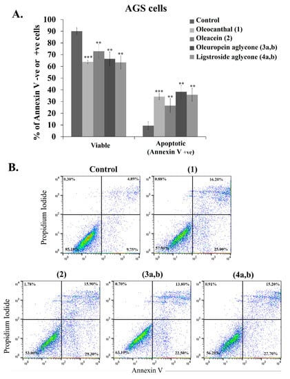 Treatment with OOPs generate apoptotic events in AGS stomach cancer cells. AGS cells were either left untreated (control) or treated with oleocanthal (1), oleuropein aglycone (3a,b), oleacein (2) and ligstroside aglycone (4a,b) at concentrations of EC50 values for 48 h. At the end of the treatments, cells were stained with annexin V-FITC and propidium iodide (Experimental Section) and were analyzed by FACS. (A) The results are presented in bar diagrams as mean values of % annexin V-negative (−ve) for the viable cells and positive (+ve) for the apoptotic cells ± SE The results are from two or three independent experiments performed in duplicate. Differences compared to untreated cells were considered significant at p < 0.01 (**) and p < 0.001 (***). (B) Representative flow cytometry dot plots demonstrating the % of necrotic (upper left), late apoptotic (upper right), early apoptotic (lower right) or viable (lower left) cell populations in the respective quadrants.