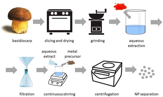 Different parts of basidiomycetes, such as mycelia or fruiting bodies, can be used for NP synthesis. The content of active chemicals in biosynthesis can differ between the mushroom’s fruiting body and the mycelia. The level of metals such as Cd, Pb, or Hg is higher in the fruiting body. The efficient concentration or so-called “biofortification” of essential ions such as Zn, Li, and Fe is also more effective in fruiting bodies [137]. Moreover, the mycelia of Agaricus sp. mushrooms typically had lower concentrations of antioxidants such as phenolic acids [141]. Mushroom antioxidants are possibly involved in the NP-forming reactions. One of the typical processes of NP synthesis mediated with aqueous extracts of basidiomycetes can be viewed in Figure 2.
