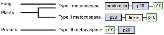 Type I metacaspases share structural similarities to caspases in that they contain an N-terminal prodomain (grey) which also includes proline-rich repeats and zinc finger motifs. Type II metacaspases lack a prodomain and contain a linker (light orange) over five times longer than caspases between the p20 (blue) and p10 (green) subunits [15,19]. Type III metacaspases have been found in phytoplankton and are characterized through the inverted sequential organization of the active subunits, with the p10 subunit situated closer to the N-terminus than the p20 subunit [15,20]. Created on BioRender.com on 6 December 2022.