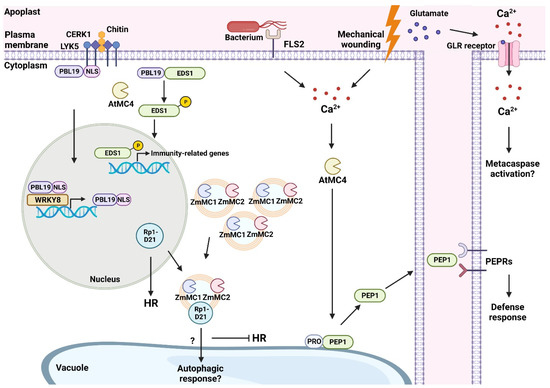 This working model depicts some plant metacaspases from A. thaliana and maize that are involved in promoting immune responses following physical damage or pathogen invasion. In A. thaliana, CERK1 (CHITIN ELICITOR RECEPTOR KINASE 1) and LYK5 (LYSM-CONTAINING RECEPTOR-LIKE KINASE 5) receptors triggered by chitin promote PBL19 (PBS1-LIKE 19) translocation to the nucleus. In the nucleus, PBL19 can self-amplify using the WRKY8 transcription factor. The metacaspase AtMC4 cleaves the NLS (nuclear localization signal) of PBL19, causing an accumulation of PBL19 in the cytoplasm. Cytoplasm-localized PBL19 can phosphorylate EDS1 (ENHANCED DISEASE SUSCEPTIBILITY 1), which promotes the transcription of immunity-related genes once phosphorylated EDS1 enters the nucleus. Mechanical wounding or bacterial flagellum activating FLS2 (flagellin sensing 2 receptor) causes an influx of Ca2+ inside the cytoplasm. This accumulation of Ca2+ activates AtMC4 which can process PROPEP1 into PEP1 and alter its localization from the tonoplast to the cytoplasm. PEP1 can then bind to PEPRs located at the plasma membrane of healthy cells to activate defense responses in neighboring cells. Mechanical wounding in A. thaliana has been shown to promote glutamate-based long-distance signaling to neighboring, undamaged cells. Glutamate binds to GLR (glutamate-like receptor) proteins that open and facilitate an influx of Ca2+ and may promote further metacaspase activation. In maize, metacaspases ZmMC1/2 follow a punctate localization in autophagosomes. The NLR protein, Rp1-D21, resides in the nucleus and can promote HR in maize. The interaction between ZmMC1/2 and Rp1-D21 causes Rp1-D21 to translocate from the nucleus to autophagosomes. The potential degradation of Rp1-D21 causes a sequestering of HR. Created on BioRender.com on 6 December 2022.