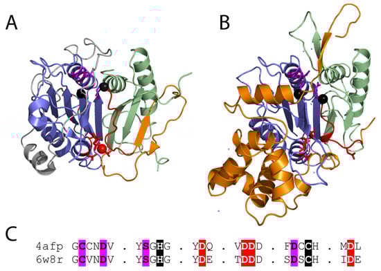 - McLuskey, K.; Rudolf, J.; Proto, W.R.; Isaacs, N.W.; Coombs, G.H.; Moss, C.X.; Mottram, J.C. Crystal structure of a Trypanosoma brucei metacaspase. Proc. Natl. Acad. Sci. USA 2012, 109, 7469–7474. [Google Scholar] [CrossRef]