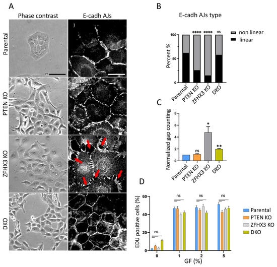 Effect of PTEN and ZFHX3 knockouts on morphology, cell–cell adherences and proliferation activity of MCF10A cells. (A) Phase contrast view and E-cadherin AJs (immunofluorescence) of cells cultivated in depleted medium (1% of horse serum) and no EGF (epidermal growth factor). Red arrows point to gaps between cells. Scale bars 100 μm for phase contrast pictures and 20 μm for immunofluorescence. (B) Quantification of E-cadherin linear and non-linear AJs within islets of parental and KOs cells. (C) Quantification of gaps between cells in cell islets. The data (B,C) represent 3 independent experiments, Sample size (the number of calculated AJs) for each experiment is: Parental 155, 114, 199; PTEN KO 86, 87, 159; ZFHX3 KO 98, 91, 161; DKO 136, 116, 189 junctions for (B,C). (D) Analysis of proliferation of obtained cells. The percentage of cells in S-phase was determined as a ratio of EdU—positive nuclei/DAPI-stained nuclei. The data represent 3 independent experiments. Measurements were performed from 6 different fields of view (N = 600−1000). Statistical analysis was performed by a contingency Chi square test in (B); unpaired t-test in panel (C), Kruskal–Wallis test in panel (D); * p < 0.05, ** p < 0.01, **** p < 0.0001 and ns: non-significant.