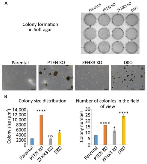 ZFHX3 KO cells formed more colonies than parental cells, but less than PTEN KO cells. All colonies of ZFHX3 KO cells were of small size. When the two KOs were combined, colony size was intermediate, in between the sizes displayed by the two single KOs. However, the number of colonies increased, indicating some synergy in between the two TSGs on this parameter.