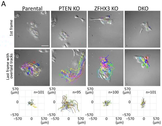 Herein, we have described in detail the complex and subtle modifications in the patterns of migration when two TSGs, PTEN and ZFHX3, were inactivated. In recent work, PTEN deletion was combined with Ras activation, which is frequently observed in tumors [52]. In this work, it was shown that expression of activated KRAS induced non-directional uncoordinated cell movement that suppressed the enhanced collective migration of PTEN KO cells, as ZFHX3 KO did in our study. It is important that the combination of PTEN and KRAS genetic alterations led to appearance of aggressive tumor cells [53] and the development of lung metastasis [54]. These two examples of PTEN inactivation combined with either inactivation of ZFHX3 or activation of KRAS illustrate how migration characteristics are controlled by cancer driver genes that are primarily well established to control cell proliferation and to which extent migration patterns are plastic.