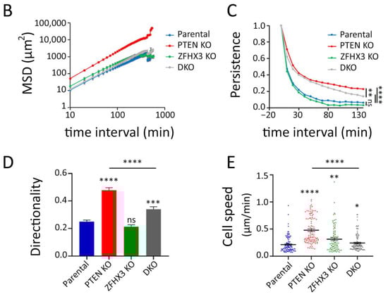 To study the behavior of epithelial islets, we recorded the motility of cells in sparse cell cultures (when only about 50% of substrate is covered with cells) in the depleted medium. Cells within small islets consisting of 5–10 cells were tracked (Movies S1–S4). Trajectories were plotted in a chart where the various cells are registered from the same origin at the center of the graph (Figure 3A). Trajectories highlighted that single PTEN KO cells in islets migrated much more actively than cells of another genotype. This is illustrated by the mean square displacement (MSD) that corresponds to the area explored per interval of time (Figure 3B). This higher exploration of PTEN KO cells was associated with increases in all parameters that contributed to migration efficiency, namely persistence, directionality and speed (Figure 3C–E). Even though ZFHX3 KO cells were forming lamellipodia and were actively migrating, they were not coordinated and islets did not move as a whole, unlike PTEN KO islets. In DKO cells, ZFHX3 inactivation suppressed to a large extent, but not completely, the increase in persistence, directionality and cell speed provided by PTEN inactivation.