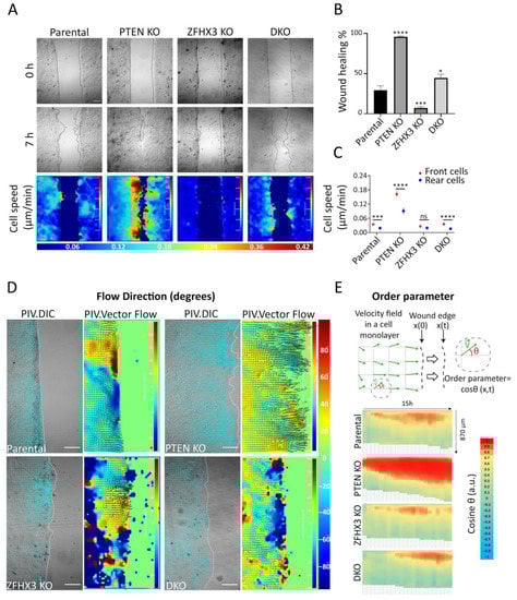 Monolayer heat maps of velocity magnitudes and flow direction inside the monolayer were built after performing PIV analysis using the open-source code PIVLab software on MatLab [60,61]. In brief, live-cell-imaging movies of wound edge (with time lapse 10 min) were processed on the PIVLab software using FFT window deformation algorithm with interrogation window of 128 × 128 px (108.8 micron × 108.8 micron), followed by two interrogation passes of 64 × 64 px and 32 × 32 px in the second and third passes, respectively, with an overlap of 50%. Erroneous vectors (shadows) were then filtered using image-based validation filters with a threshold (0.005). Average velocity values (means with SEM) of posterior and frontal cells were extracted over 7 h of migration from three independent experiments, and the results then were statistically analyzed in GraphPad software with a Mann–Whitney test between front and rear cells in parental and DKO conditions and an unpaired t-test between front and rear cells in PTEN KO and ZFHX KO conditions.