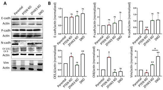 Next, we checked how the alterations of motility behavior caused by KOs of PTEN and ZFHX3 are associated with other EMT characteristics. First, we analyzed by Western blot the expression of the EMT markers E-cadherin; N-cadherin; cytokeratins 5, 6, 8; and vimentin (Figure 5A,B). As an additional marker, which is more indicative of partial EMT, we used P-cadherin [39]. The KOs of both PTEN and ZFHX3 and their combination did not affect E-cadherin levels. N-cadherin expression was significantly reduced in PTEN KO and remained practically unchanged in other cell lines (Figure 5A,B). Basal cytokeratins 5/6 were increased in PTEN KO and DKO cells. The expression of cytokeratin 8, which was typical of luminal epithelial cells, was also increased in PTEN KO but not in DKO cells. A small amount of vimentin, which is one of the main markers of EMT, was expressed by parental MCF10A cells in depleted medium (Figure 5A,B). PTEN KO decreased vimentin expression, whereas ZFHX3 KO and DKO cells increased vimentin levels significantly (Figure 5A,B). P-cadherin levels did not change as a result of PTEN and ZFHX3 KO, but slightly increased in DKO cells, in a non-significant manner (Figure 5A,B).