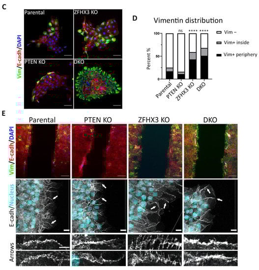 We paid special attention to the position of vimentin-positive (Vim+) cells, either inside or at the border of islets. In parental MCF10A, Vim+ cells often localized at the border of islets. The very rare Vim+ cells in PTEN KO cultures were also localized at the periphery of islets. In ZFHX3 KO cultures, the number of Vim+ cells significantly increased both inside and at the periphery of islets. DKO exhibited an additional increase of Vim+ cells, most of which localized at islets’ periphery (Figure 5C,D).