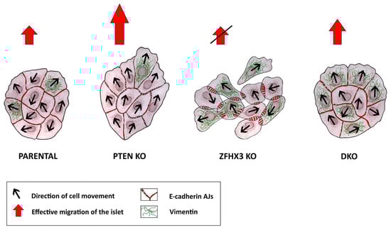 The main goal of our work was to analyze the alterations in cell migration caused by PTEN and ZFHX3 KOs. Both knockouts and their combination led to reorganization of AJs, making them weaker. As a result, the cells became more motile, but in the case of PTEN KO, they still maintained good cell–cell contacts and thus could move as a coordinated group.