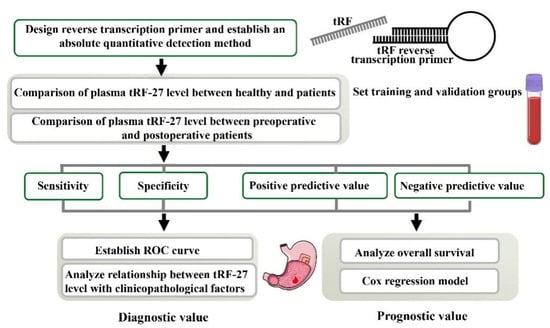 The involvement of tRFs in the development and progression of cancer is still poorly understood. Our previous study reported that tRF-5026a could inhibit the proliferation, cell cycle progression, and migration of gastric cancer cells by regulating the phosphatase and tensin homologue deleted on chromosome ten/phosphatidylinositol 3-kinase/protein kinase (PTEN/PI3K/AKT) signaling pathway [25]. Furthermore, with the development of high-throughput sequencing, it was found that tRFs exist in various specimens, such as tissues, serum, and plasma [15]. Abnormally expressed tRFs have been demonstrated to be closely related to tumorigenesis, with many tRFs serving as potential biomarkers for cancer diagnosis and prognosis [29,30,31]. Gastric cancer has the highest morbidity and mortality rates in the world [32]. The development of gastric cancer has numerous risk factors such as genetics, gastric ulcer, gastroesophageal reflux disease, infectious agents including Epstein-Barr virus and Helicobacter pylori infection, and lifestyle-related risk factors including alcohol and diet [32,33]. Gastric cancer has an asymptomatic nature in the early stage, making timely diagnosis challenging when routine examination including imaging and pathological approaches are used [33]. The key to improving the survival of gastric cancer patients is to diagnose and treat the disease in its early stage [32,33,34]. Blood is the most commonly collected specimen, and the collection of peripheral blood is not invasive and not painful; thus, the procedure is accepted by many individuals [35,36]. In this study, tRF-27 was demonstrated to be a gastric-cancer-associated tRF (Figure 2A). We designed a specific reverse transcription primer and established an absolute quantitative method to measure plasma tRF-27 levels in different groups with gastric cancer to determine its diagnostic and prognostic value (Figure 1).
