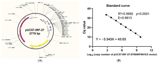 Standard curve used for the absolute quantification of plasma tRF-27 levels. (A) Map of the pUC57-tRF-27 recombinant plasmid. (B) Standard curve of absolute quantitation.
